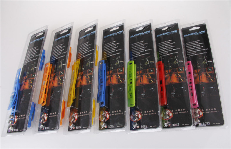 Super Bright Light Up LED Cycle Lights With Custom Logo / Illuminated Bike Light Intruduce: SupperFlare is a portable self contained safety device having a flexible solid core side emitting fibre optic element interposed between two electronic housing ends; inside each of the housing ends is a single high intensity LED. When the LED's illuminate in unison they emit a high intensity uni-directional light beam that is directed into each end of the fibre optic core; the fibre